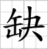 Writing sheet of the character : - quē 缺 (Manquer de / incomplet / insuffisance / manque / place vacante)
