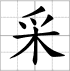 Writing sheet of the character : - cǎi 采 (Cueillir / saisir / tirer vers le bas / potentiel extensif)